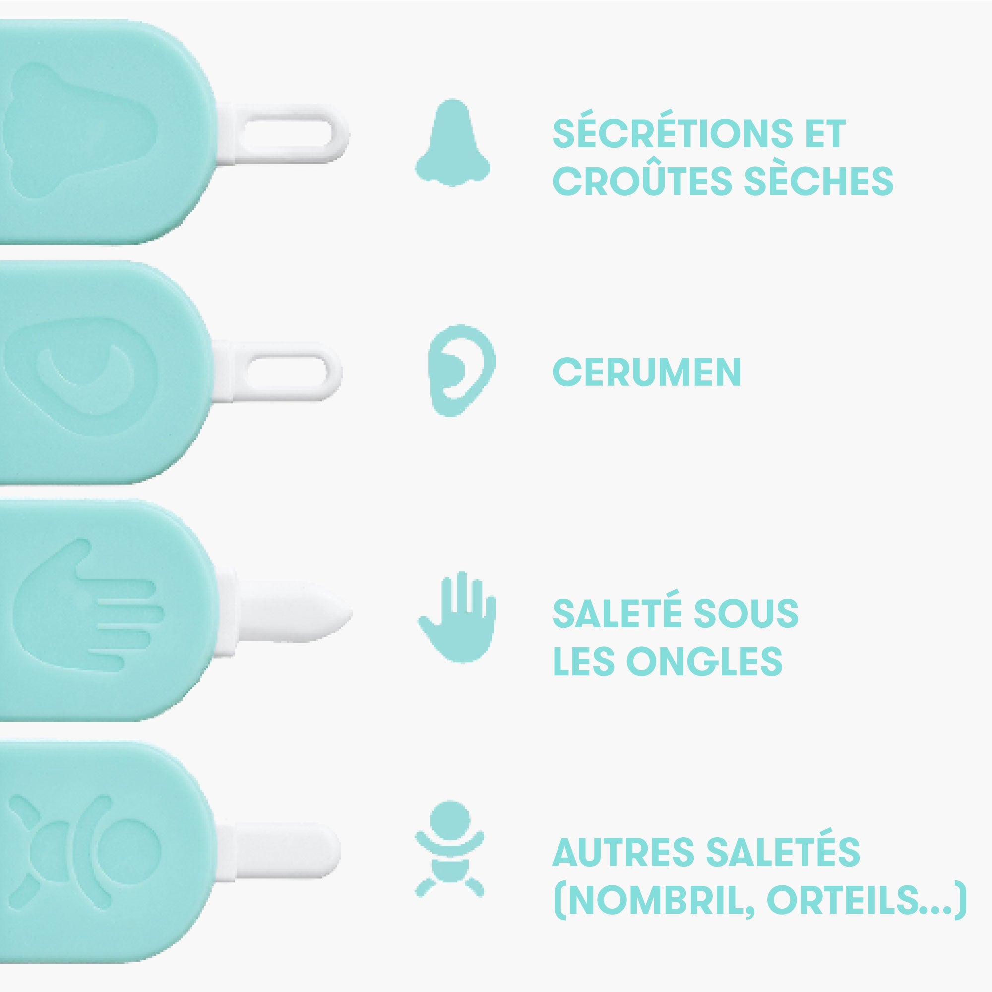 Si votre bébé présente des signes d’infection ou de douleur aux oreilles, il est préférable de consulter un pédiatre avant d’utiliser la curette. La curette est conçue pour un nettoyage de routine, mais en cas d’infection ou de soucis médicaux, un professionnel de santé pourrait recommander d'autres solutions.